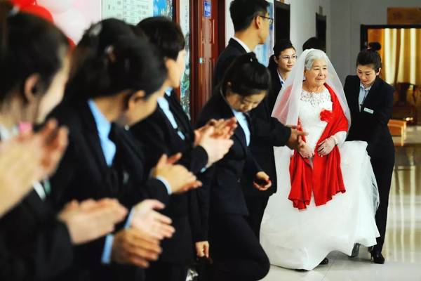 22日,在大慶天堂墓園的接待大廳,一場(chǎng)特別的婚禮正在舉行,90歲的彭海春牽著(zhù)82歲的李桂芹走入紅毯的一瞬間,一切都是有意義的存在。