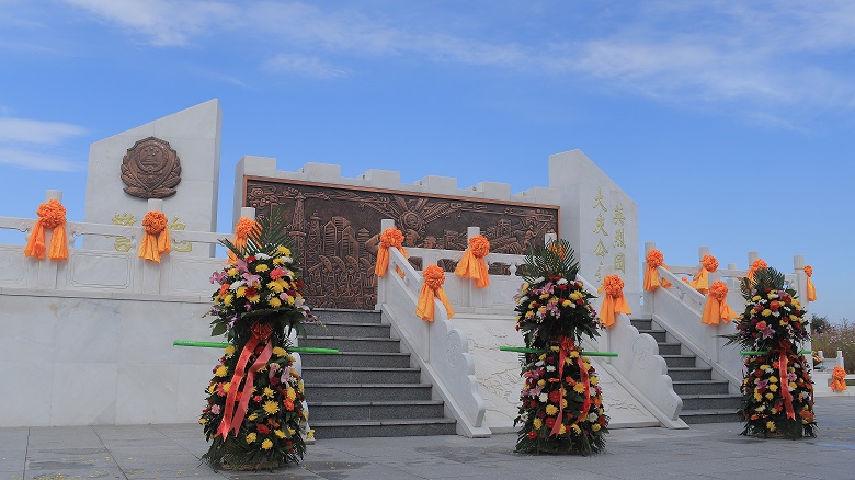 主體形象墻是英烈園的中心建筑,位于墓前廣場(chǎng)與英烈墓地之間,坐北朝南,由臺基、主題浮雕和兩翼劍型墻組成,整體呈中低側高之勢,猶如雄鷹振翅欲飛,寓示大慶公安銘記英雄、繼承遺志、發(fā)揚精神、勇創(chuàng )輝煌之意。兩側的劍型碑象征公安機關(guān)打擊違法犯罪和保障人民群眾生命、財產(chǎn)安全的兩把利劍。劍形碑與浮雕墻成15度角,劍尖直指蒼穹,彰顯了大慶公安的氣魄和力度。左側碑上刻有警徽圖案和“警魂”字樣,右側碑上刻有“大慶公安英烈園”的墓園名稱(chēng),兩碑的背面分別用中英文刻有大慶公安英烈園的墓志銘。形象墻最高處3.7米,寓意大慶公安成立至今37年。其中,臺基共8級臺階,寓意已犧牲的8名英烈;浮雕墻為長(cháng)城形狀,寓意人民公安是國家和人民的鋼鐵長(cháng)城;主題浮雕長(cháng)9米,寓意英烈精神長(cháng)久永存;高2.016米,代表2016年建成;浮雕正面由英烈形象、長(cháng)城、油井等元素構成,彰顯大慶公安英烈舍生忘死、用血肉之軀保家衛國的英雄氣概;浮雕背面鐫刻已犧牲英烈的照片、個(gè)人自然狀況、英雄事跡及因公犧牲民警姓名,讓人們永遠牢記英雄的名字,銘記他們的感人功績(jì)!